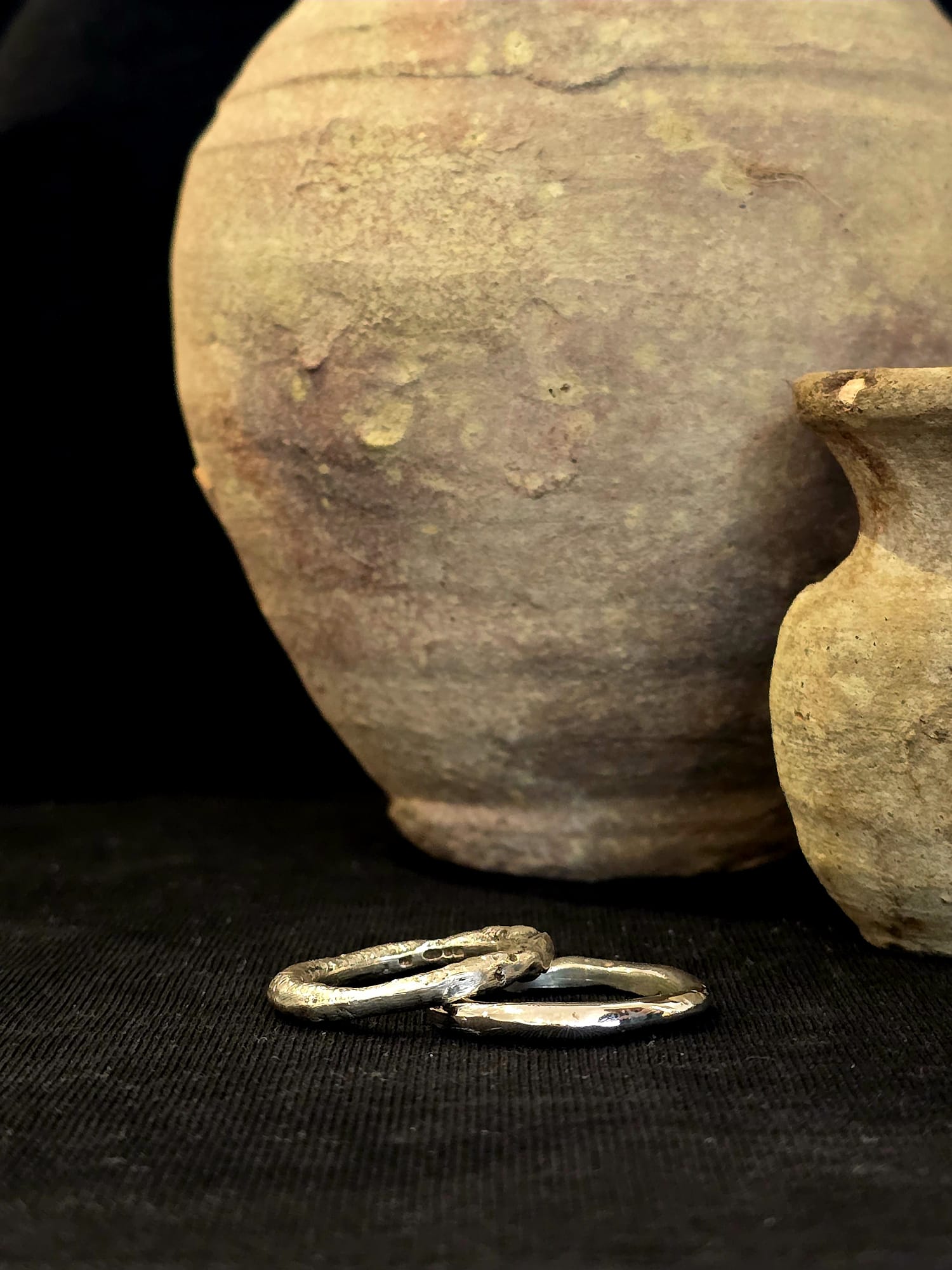 A singular solid silver sandcast ring created fully in-house from wax design to finished piece.